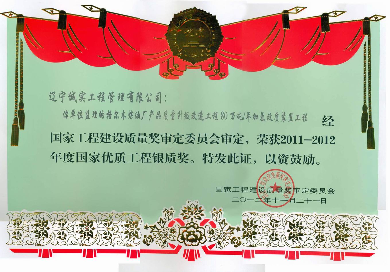 2011-2012年國(guó)家優(yōu)質(zhì)工程銀質(zhì)獎(jiǎng)(格爾木煉油廠)