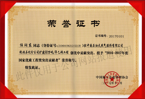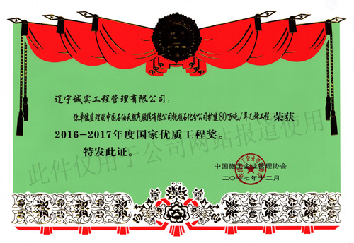 2017年11月10日,根據(jù)中施企協(xié)字【2017】66號文件——《關(guān)于表彰2016-2017年度國家優(yōu)質(zhì)工程獎的決定》公告,我單位所監(jiān)理的“中國石油天然氣股份有限公司撫順石化分公司擴(kuò)建80萬噸/年乙烯工程”榮獲2016-2017年度國家優(yōu)質(zhì)工程獎,該項目總監(jiān)“任潤東”還獲得了“2016-2017年度第二批國家優(yōu)質(zhì)工程獎突出貢獻(xiàn)者”的榮譽稱號。