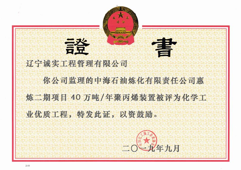 2019年9月,我單位所監(jiān)理的“中海石油煉化有限責任公司惠煉二期項目40萬噸/年聚丙烯裝置”被評為化學工業(yè)優(yōu)質工程獎。