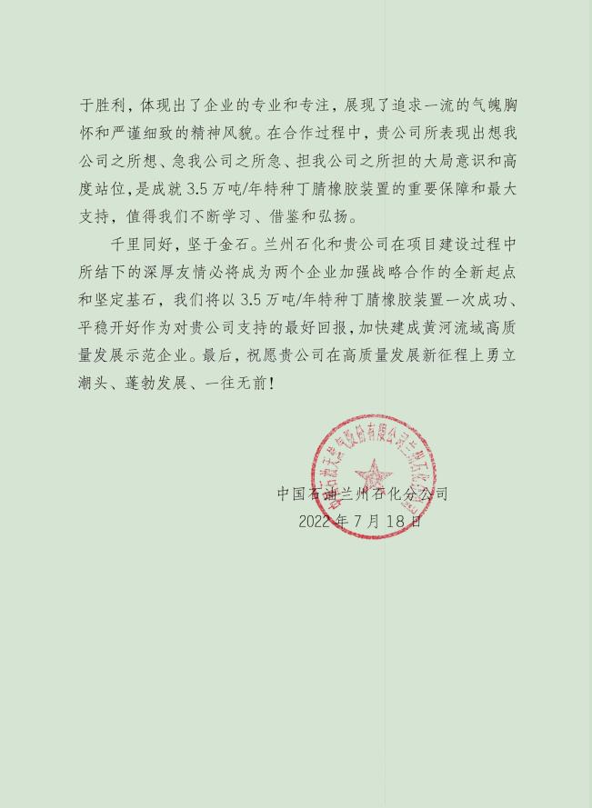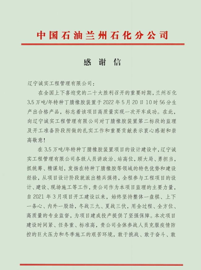 近日,由我公司監(jiān)理的中國石油天然氣股份有限公司蘭州石化分公司--3.5萬砘/年特種丁腈橡膠項目喜獲業(yè)主表揚信。表揚信充分肯定了誠實監(jiān)理的工作成果,對駐蘭州項目部全體監(jiān)理工程師在項目建設過程中所付出的努力表示由衷的感謝。