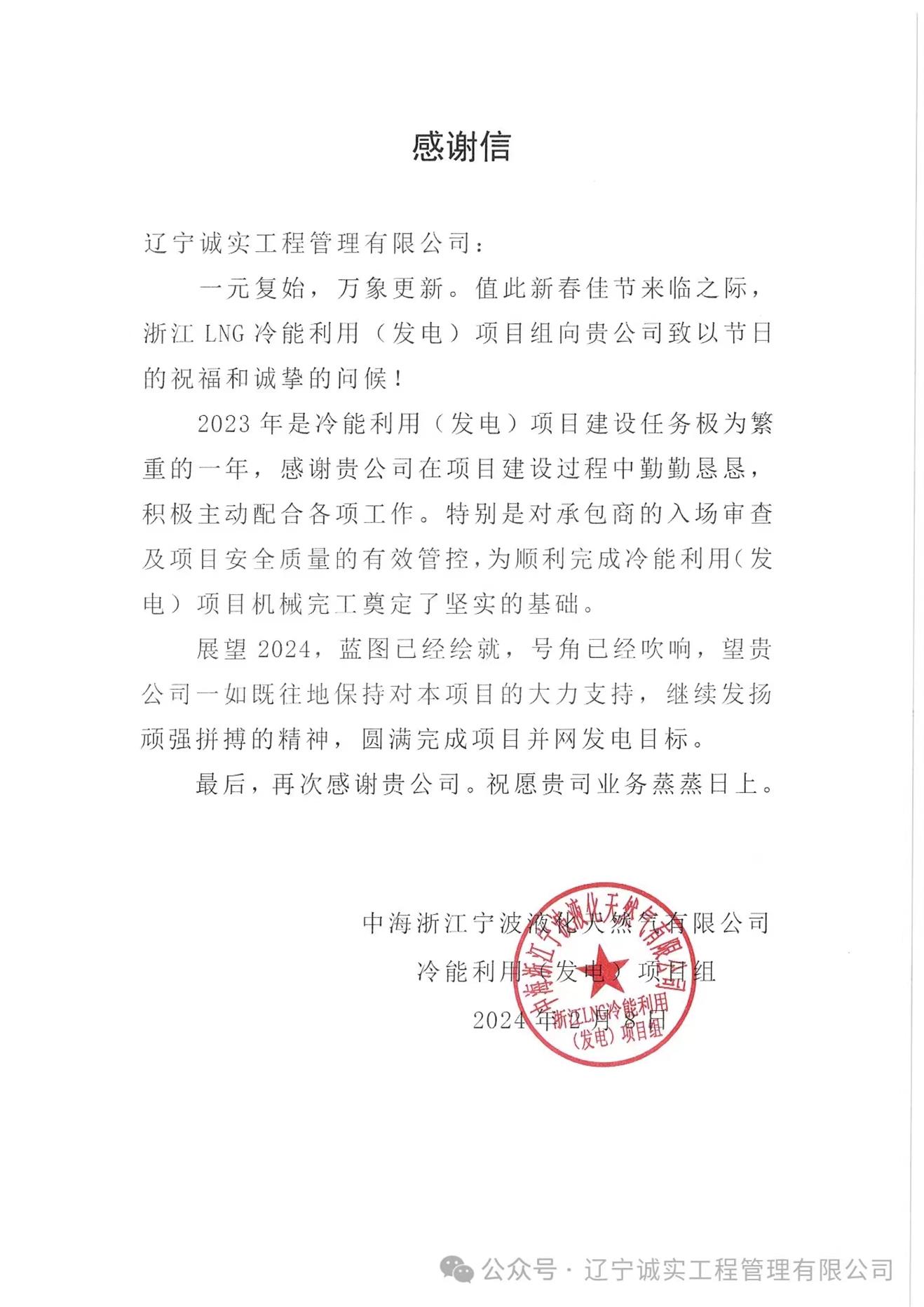 浙江LNG冷能利用(發(fā)電)項目組向公司發(fā)來了感謝信,信中肯定了公司項目部人員在2023年的努力,特別是對于承包商入場審查及項目安全質(zhì)量的有效管控,為項目機(jī)械完工奠定了堅實的基礎(chǔ)。該項目是積極響應(yīng)國家及浙江省“十四五”規(guī)劃的節(jié)能減排政策,落實“綠色低碳”發(fā)展戰(zhàn)略的示范項目,項目投產(chǎn)后,預(yù)計年凈發(fā)電量約為2408萬度,節(jié)省標(biāo)準(zhǔn)煤超3000tce,年減少CO₂排放可達(dá)18000多噸。展望2024年,項目部在黃思敏總監(jiān)的帶領(lǐng)下,將認(rèn)真執(zhí)行監(jiān)理職責(zé),積極推進(jìn)項目建設(shè),爭取項目早日建成投產(chǎn)。