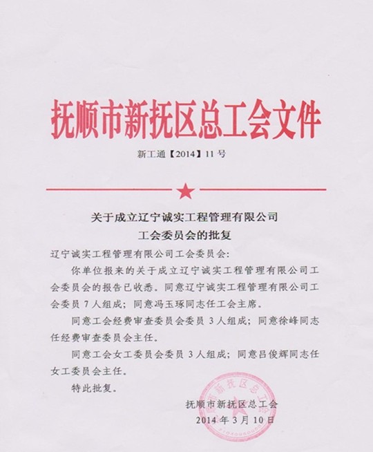 經(jīng)過近兩個(gè)月的籌備,誠(chéng)實(shí)工會(huì)現(xiàn)已履行完畢各個(gè)籌備程序,撫順市新?lián)釁^(qū)總工會(huì)已正式批準(zhǔn)成立遼寧誠(chéng)實(shí)工程管理有限公司工會(huì)委員會(huì)。公司工會(huì)由7名委員組成,下設(shè)經(jīng)費(fèi)審查委員會(huì)和女工委員會(huì)。公司工會(huì)將根據(jù)機(jī)關(guān)及項(xiàng)目部的實(shí)際情況,相應(yīng)成立工會(huì)分會(huì)和工會(huì)小組,發(fā)揮工會(huì)在企業(yè)中的積極作用,為企業(yè)的發(fā)展做出貢獻(xiàn)。