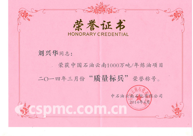 劉興華同志榮獲中國石油云南1000萬噸/年煉油項(xiàng)目2014年3月份“質(zhì)量標(biāo)兵”榮譽(yù)稱號